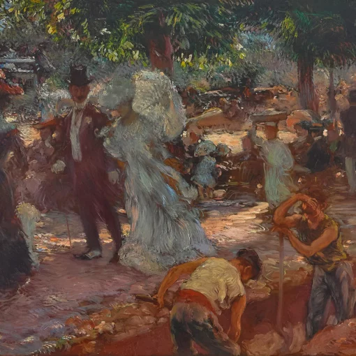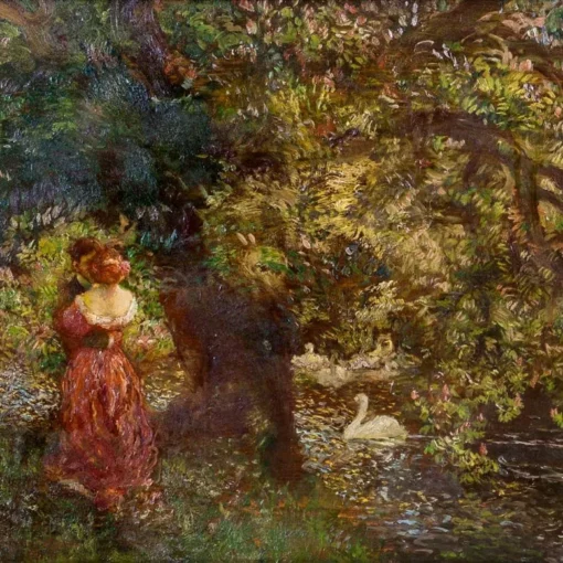 Dans cette toile lumineuse, Gaston La Touche saisit l’éclat éphémère du printemps avec une sensibilité typiquement impressionniste. Cerisiers en fleurs présente un verger baigné d’une lumière douce, où les tons rosés et verts se fondent dans une atmosphère vibrante. L’artiste y exprime un sentiment de légèreté et de ravissement devant la nature renaissante.