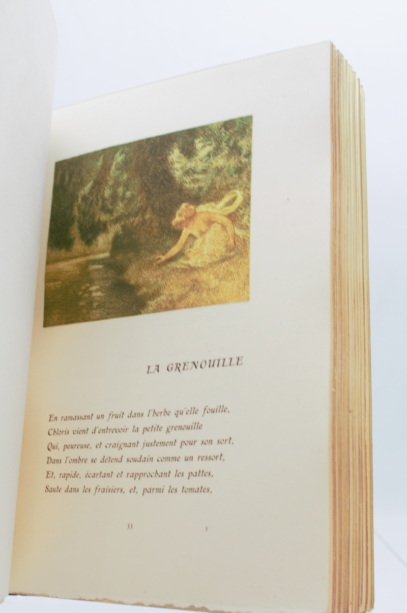 Compositions et gravures de Gaston La Touche. Paris, aux dépens de deux amateurs, 1911. Petit in-4° broché, sous chemise à rabats de l’éditeur, cordonnets en soie. Bel ouvrage orné de 32 compositions en couleurs dont un frontispice et 31 à mi-page, chacune illustrant une chanson dont la partition figure en fin d’ouvrage. Tirage limité à 125 exemplaires numérotés