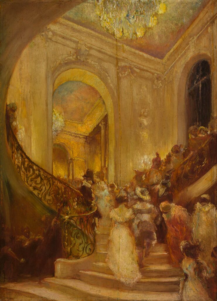 Ce tableau représente une scène animée à l’Opéra de Paris, où des visiteurs élégants montent l’imposant escalier. Comme chez ses contemporains impressionnistes, tels que Degas, le cadre met en lumière une vue en coulisses de la vie parisienne et de ses artistes.