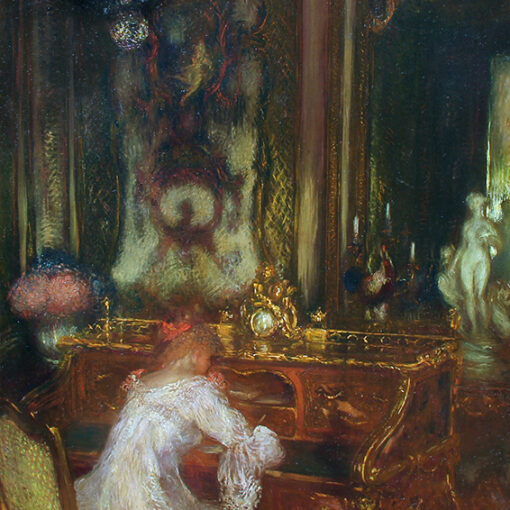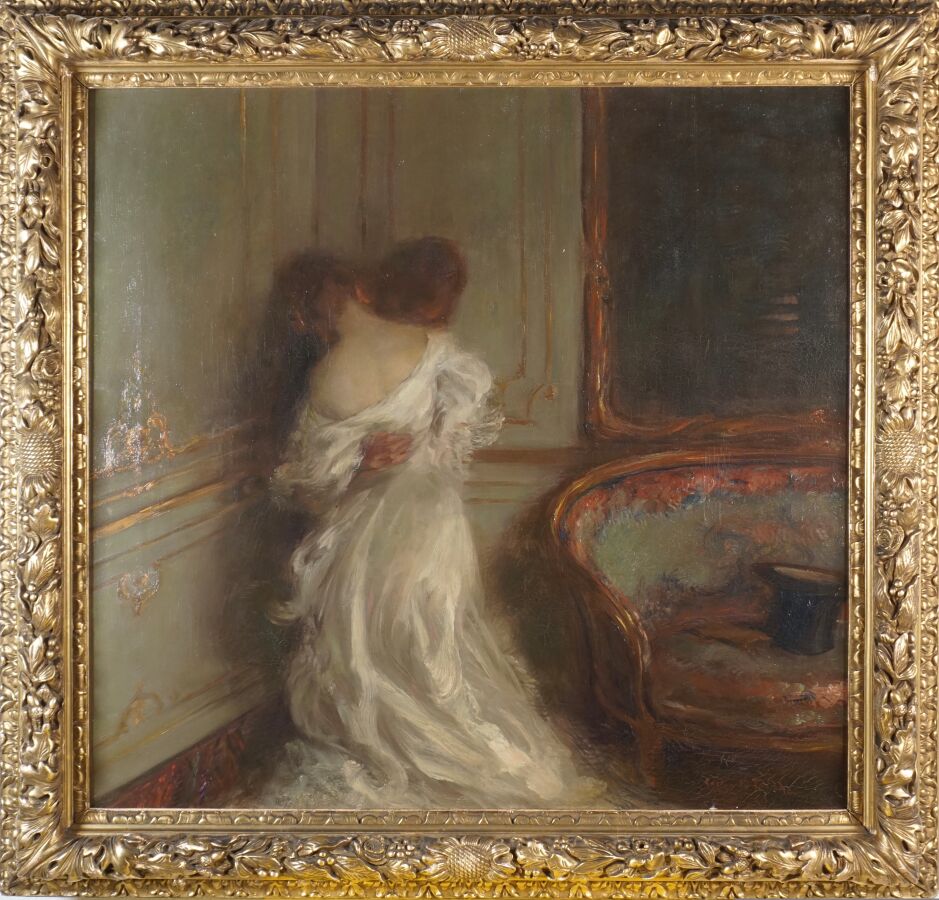 Ce magnifique tableau séduit de vente en vente atteignant en 2025 plus de 25000€ aux enchères. En effet, nous voyons ici le reflet d’une peinture générale se libérant de plusieurs codes de la peinture de l’époque. Cette robe dont le détail des replis est impressionnant, crééee le mouvement de la scène, l’esquisse du début du sofa sur lequel l’homme a laissé son chapeau et ses gants pour se livrer à sa belle, c’est tout simplement osé et envirant.