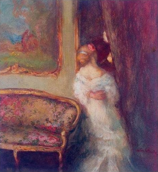 Plus colorée, plus tenue également (les cheveux sont attachés, la robe se tient plus), avec le canapé de l’autre côté, cette gouache n’est pas moins forte car cette ouverture de rideau laisse entrevoir l’homme qui se cache ou qui vient d’entrer par l’autre pièce. Est-il amant ? Est-il mari ? Nous ne le savons mais le détail des éléments comme le canapé ou le tableau nous amène les bonheurs de la vie qui sont et restent là, présents, témoins de la scène.