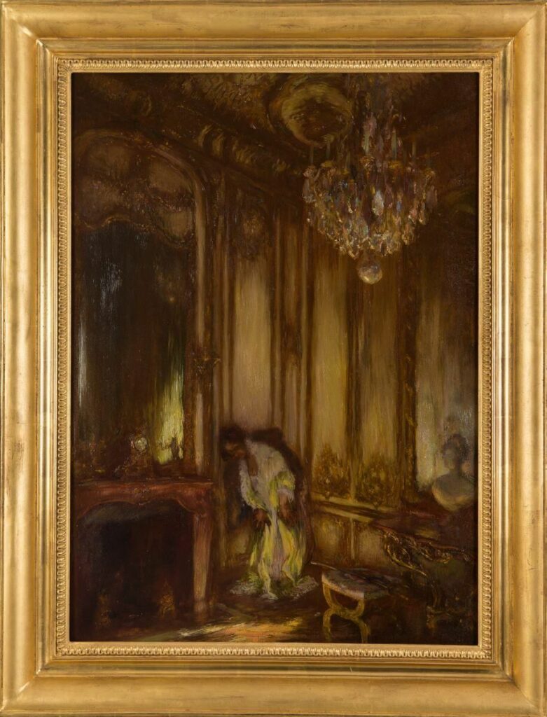 Comme le peintre Édouard Vuillard (1868-1940), Gaston La Touche s’intéresse à la représentation des intérieurs mondains et feutrés, ornés de belles boiseries rehaussées d’or, de consoles précieuses, de lustres en cristaux distribuant la lumière. Dans cette scène d’intérieur, le décor tient une place importante en occupant les deux tiers du tableau. La pièce représentée serait celle de la pièce de la vaisselle d’or dans l’appartement intérieur du roi à Versailles avec son aménagement du début du XXe siècle.
