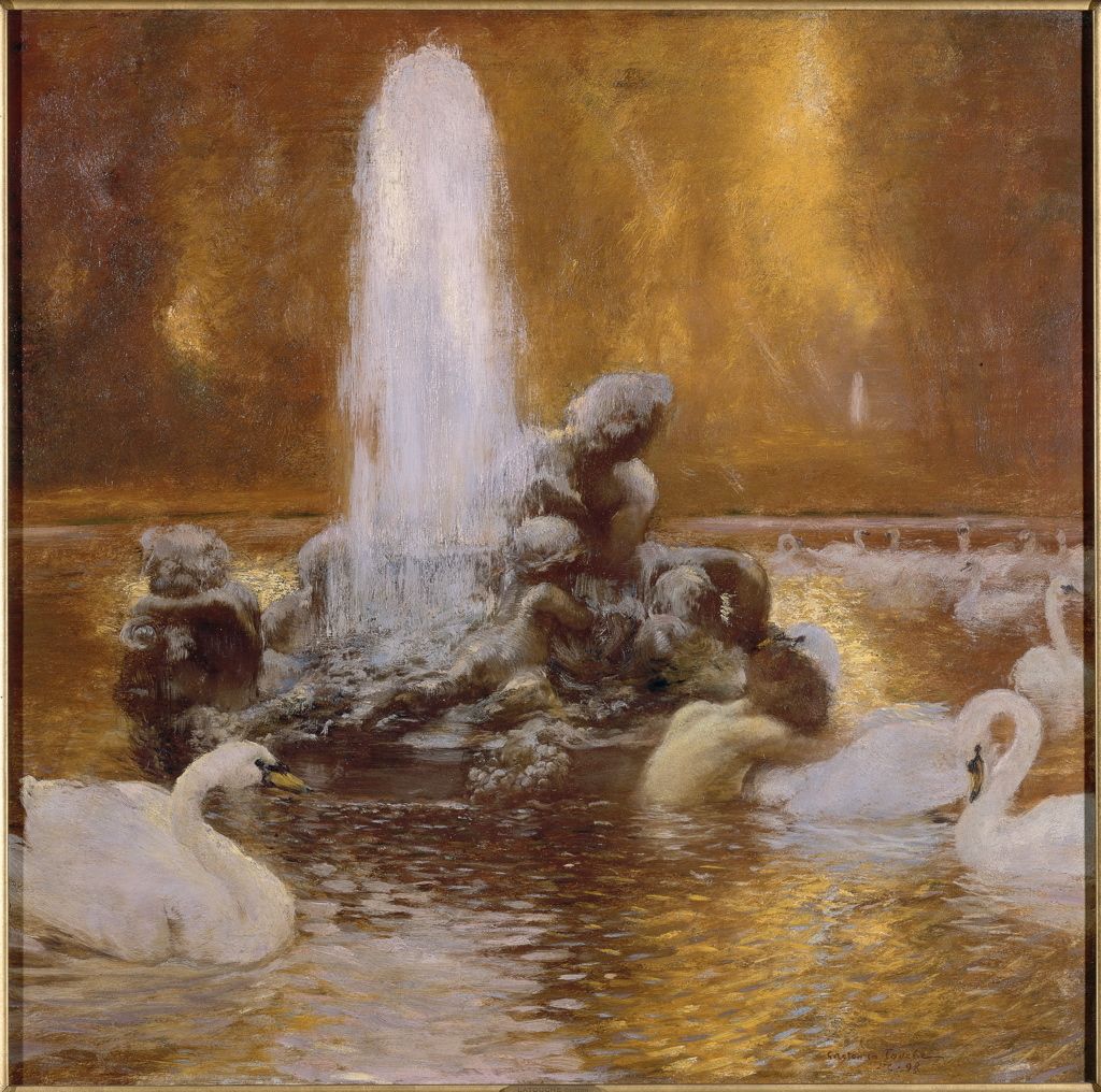 Jacques-Émile Blanche (1861-1942) à la même époque, Gaston La Touche a peint à de multiples reprises la beauté du parc de Versailles et particulièrement de ses bassins. Il s’agit précisément dans ce tableau du Bassin de Bacchus ou L’Automne de Gaspard Marsy (1624-1681). Au centre de la composition où dominent les couleurs de l’automne, un groupe sculpté de putti, duquel s’élance un jet d’eau, brille sous le soleil. Des cygnes – symboles de fidélité et d’amour éternel, que l’on retrouve régulièrement dans l’œuvre de La Touche – flottent majestueusement sur les eaux chatoyantes. Ils sont accompagnés d’une nymphe dont on aperçoit le dos et la chevelure châtain. Le peintre évoque ici une scène de pure fantaisie et peuple ce décor de rêve d’un personnage né de son imagination.