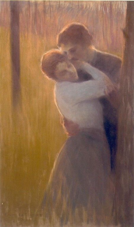 Ce pastel est une œuvre préparatoire ou inspirée d’un tableau du même nom dans lequel les amoureux ont les mêmes attitudes. Dans le pastel, Gaston La Touche centre son sujet sur le couple qui surgit d’une lumière crépusculaire. Sur un fond de forêt, la jeune femme, de profil, et l’homme, de face, se retrouvent pour un rendez-vous que l’on imagine secret, voire défendu – la jeune femme s’écarte alors que l’amant lui vole un baiser. Les teintes automnales, les rayons du soleil qui filtrent à travers les arbres donnent à ce pastel une intense luminosité. De grand format, il est l’un des premiers pastels connus de l’artiste. Signé deux fois, une fois en bas à gauche en noir et en majuscule et en bas à droite, en rouge, Gaston La Touche l’expose en 1908 (n°319) aux Galeries Georges Petit lors de sa grande exposition. Daté de 1893, il témoigne, par son caractère encore un peu social, d’une époque de transition dans la carrière de l’artiste. Son ancrage populaire le rapproche des œuvres d’Émile Friant (1863-1932) et de Pascal Dagnan-Bouveret (1852-1929).