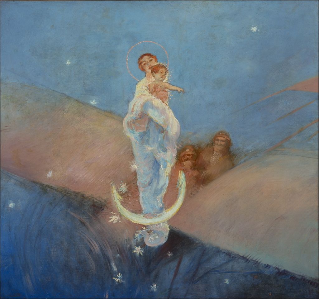 Gaston La Touche, quant à lui, propose au chanoine Richard, le curé de la paroisse, de peindre pour le chœur, une vaste toile représentant Notre-Dame auxiliatrice, protectrice des airs. Cette huile sur toile n’est autre qu’une esquisse pour ce projet, malheureusement interrompu par la mort de l’artiste en 1913.
