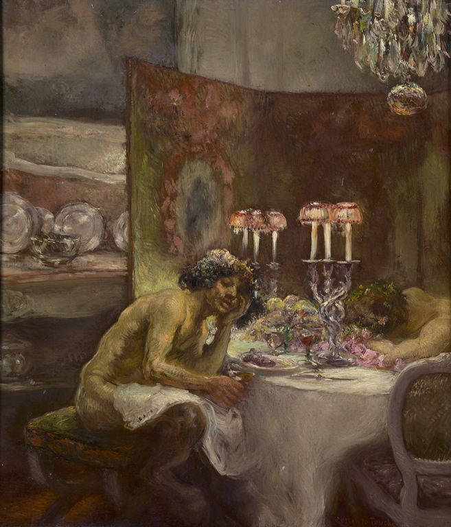 « Une table de souper, dans un intérieur moderne : les bougies brûlent encore sous les abat-jour, mais la nuit s’est enfuie, et l’aube fait pâlir les choses. Et voici que, de chaque côté de la table, deux faunes se rencontrent, déracinés de l’Attique païenne : l’un a la tête écroulée sur la table, tout près d’une guirlande de roses, l’autre, accoudé sur le bras gauche, tient de sa main droite une dernière coupe qu’il hésite à vider.