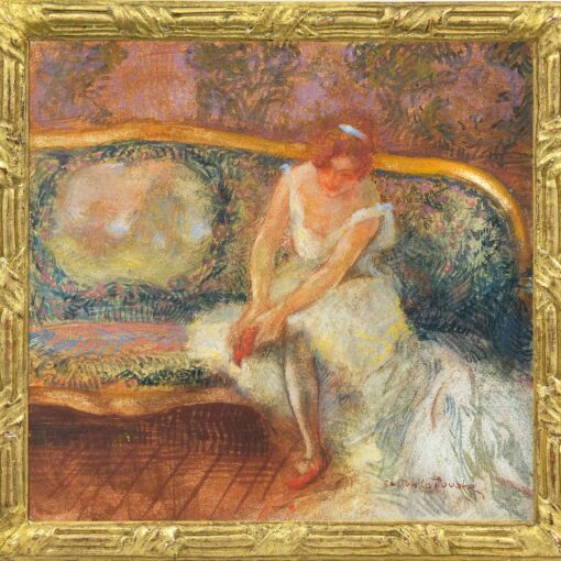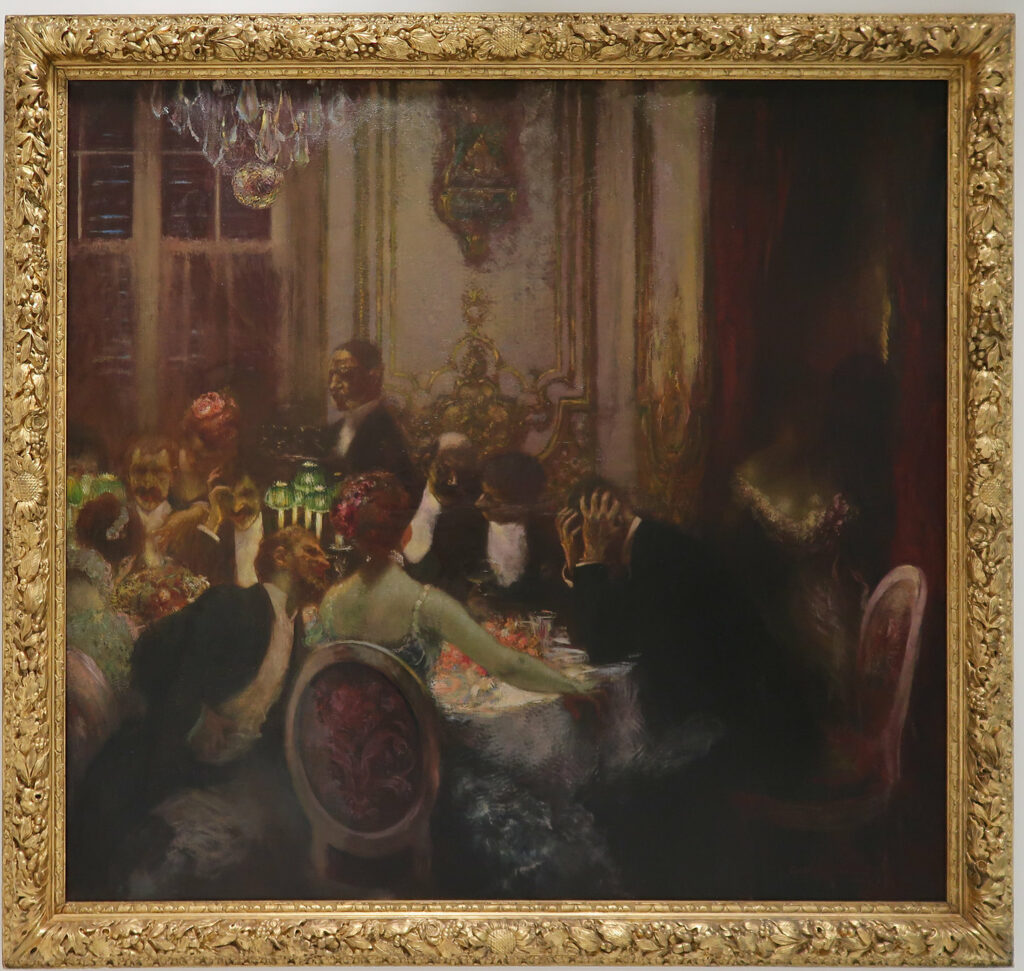 Nous y voyons au centre Gaston La Touche lui-même penché pour discuter avec son voisin. Les teintes sont spéciales et les visages des hommes assez horribles. Les mains tendues sur la tête de l’homme au premier plan montre une volonté pour La Touche de dénoncer les réalités qui peuvent avoir lieu dans des diners chics où les hommes sont comme des bêtes. Nous ne sommes pas dans les fêtes galantes représentées par ailleurs par La Touche où la joie et les couleurs n’amènent que du positif.