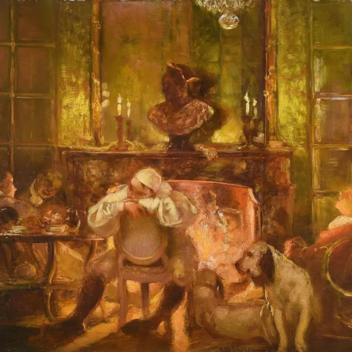 Le traitement pictural, fait de touches légères et fusionnées, dissout les formes dans une atmosphère de lumière diffuse. La Touche, héritier de l’impressionnisme mais sensible à la tradition des fêtes galantes de Watteau et Fragonard, propose ici une vision idéalisée du passé — un monde d’élégance et d’insouciance, transfiguré par la poésie du souvenir.